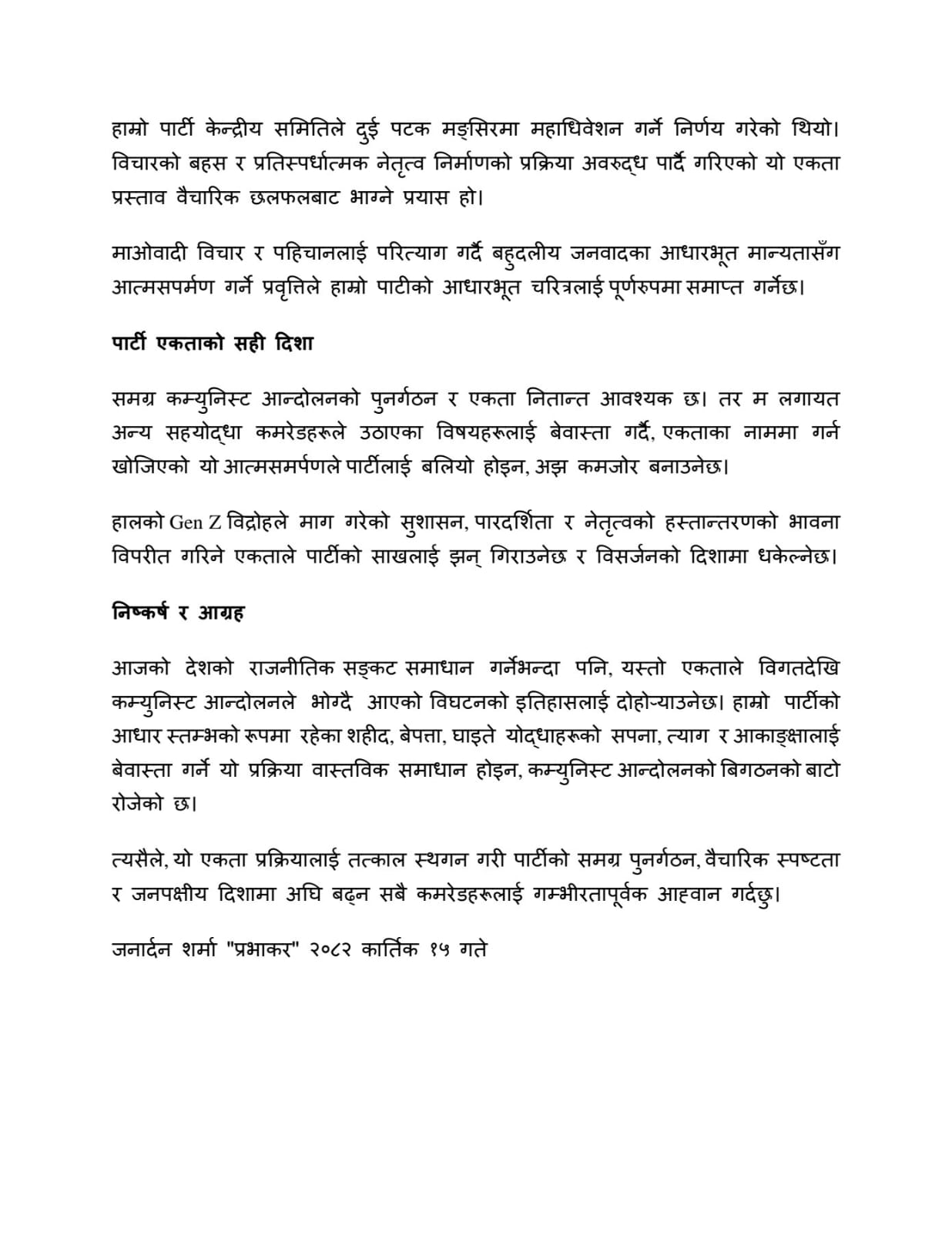 माओवादी केन्द्र पार्टीको आज सबेको सचिवालय बैठकमा जनार्दन शर्मा प्रभाकरले केहि सिमित ब्यक्तिको स्वार्थ र पार्टीको महाधिबेशन टार्नका लागि गर्न खोजिएको उनको भनाई छ । नेकपा माओवादी केन्द्र र एकिकृत समाजवादीको एकता प्रक्रियालाई तत्काल स्थगन गरी पार्टीको समग्र पुनर्गठन, वैचारिक स्पष्टता र जनपक्षीय दिशामा अघि बढ्न सबै कमरेडहरूलाई गम्भीरतापूर्वक आह्वान गरेका छन ।